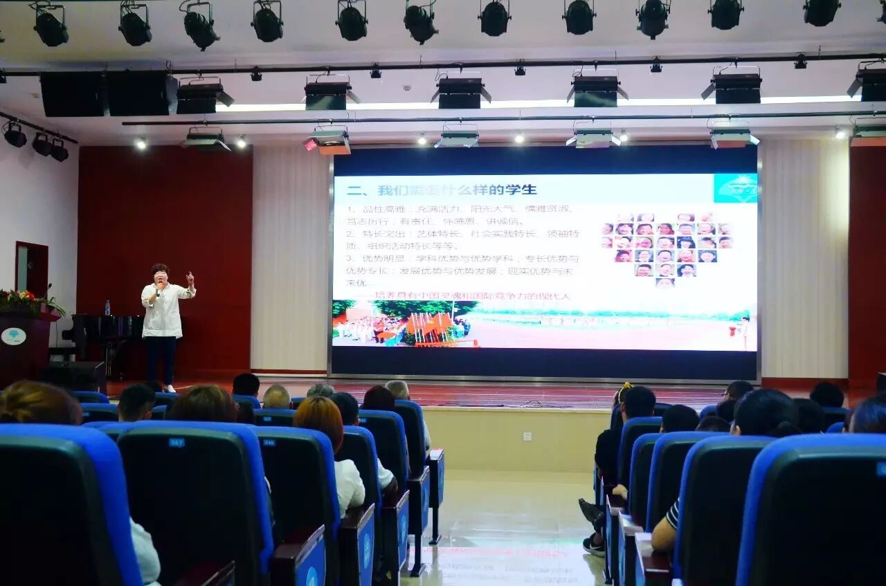 许校长指出,我们对学生的培养目标是:品性高雅、特长突出、优势明显。同时也要为学生的未来发展进行规划,课程的设计、执行要紧紧围绕“筑基具有中国灵魂和国际竞争力的现代化人才”这一理念。为此,我们在教育教学中要践行三个100%-----100%关注个体身心健康,100%关注个体个性发展,100%关注个体优势发展。培养并形成学生优于同龄同学的竞争优势和发展优势,提供适合每一个学生的成长方案,全方位、立体化提升学生的学习能力、实践能力和人文素养。