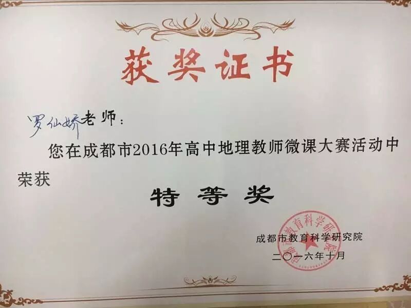 2016年10月19日,成都七中实验学校青年教师罗仙娇在成都市教育科学研究院组织的高中地理教师赛课活动中,经过与来自全市的优秀同行的同场竞技,脱颖而出,荣获特等奖。