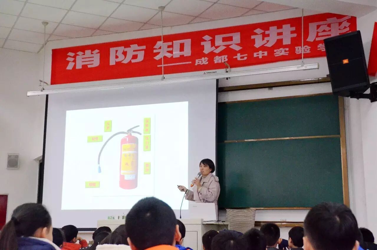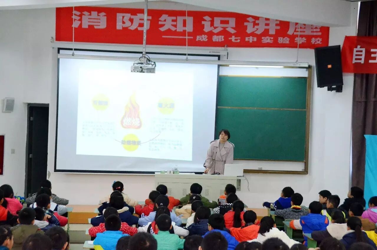 和谐校园,平安为先。为了帮助学生树立和增强消防安全意识,提高防灾自救能力,确保师生的生命安全, 2016年11月29日下午,成都七中实验学校小学部举办了消防安全知识学习活动,特邀成都世安公司注册工程师、消防工程师周廷安女士进行专题讲座,参与活动的是五年级学生及全体生活老师。