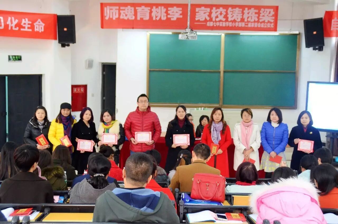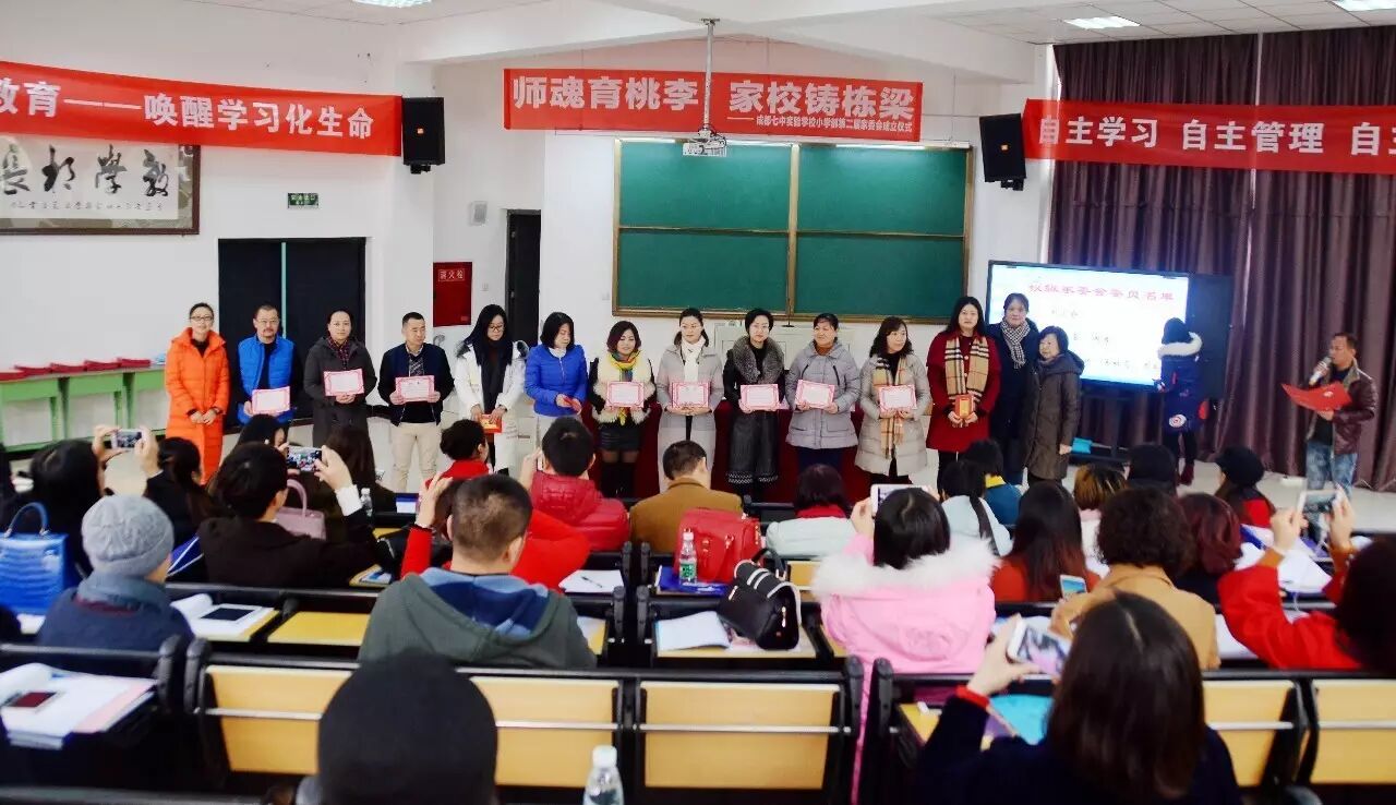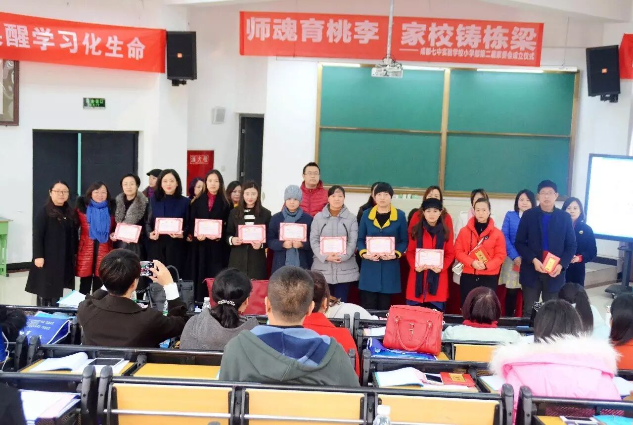 ——七中实验学校小学部第二届家委会成立 家校合作是实现高品质学校教育和良好家庭教育的有效途径。在这个银杏叶飘飞的季节,12月2日上午十时整,在学校领导的精心筹备下,成都七中实验学校小学部以“师魂育桃李,家校铸栋梁”为主题的第二届家委会成立大会在小学部阶梯教室隆重举行。“师魂育桃李,家校铸栋梁”这十个大字诠释了家校合作的精髓。在大教育观引领下应运而生的家委会是学校、家庭、社会有机结合的纽带和桥梁,家校合作的成效有待展望。