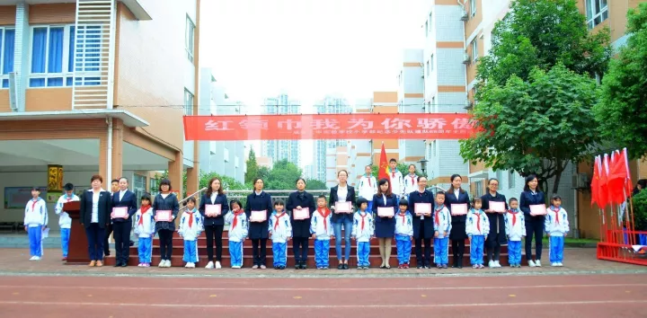 在这个特别的节日里,小学部少先队家庭越来越壮大,本学期新成立的11个中队光荣加入了中国少年先锋队。大队辅导员唐老师介绍了新中队以及新聘任的中队辅导员,许丽萍校长为新中队辅导员们颁发了中队辅导员证书,少先队员为老师们佩戴上鲜艳的红领巾,飘扬的红领巾与红色证书,交相辉映。随后,学校领导为新中队授予了新中队旗,火红的队旗,迎风招展,蕴含了无限的力量,仿佛正指引着少先队员们,放飞新时代的梦想!
