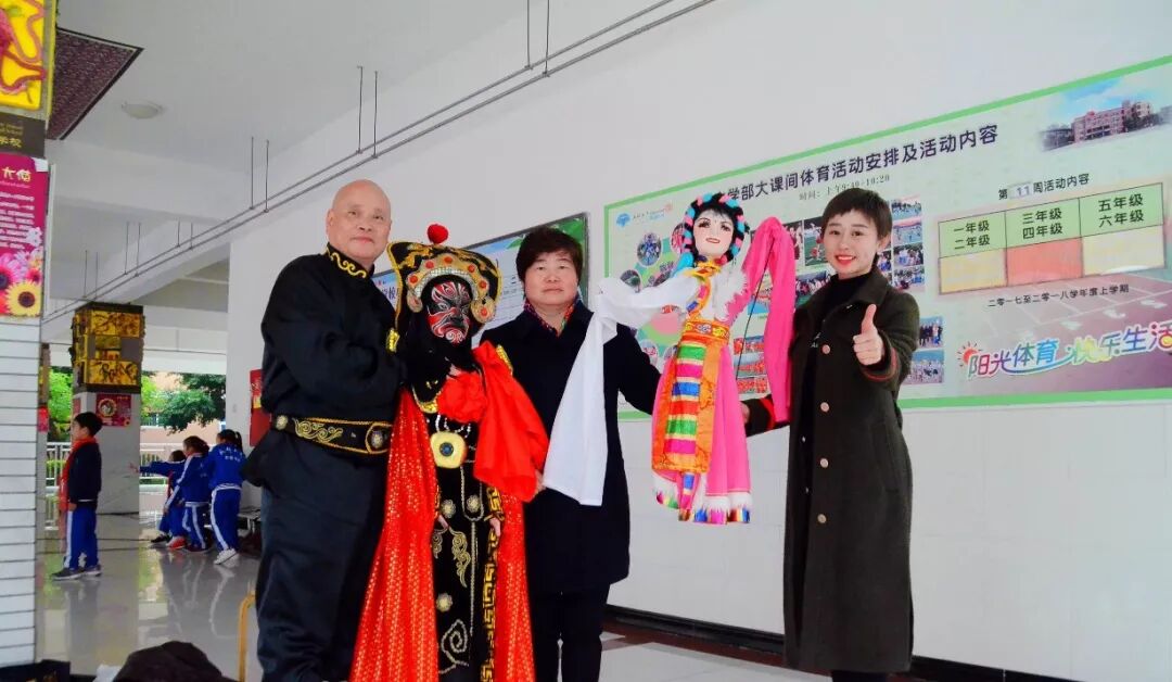 成都电视台主持人、2018《成都非遗文化进校园》总策划王睿老师还融入互动环节,请了同学代表跟着罗老师学习手法,体验木偶的舞台动作,不仅让同学们零距离地感受非物质文化遗产的魅力,同时也在全校师生们面前大声地宣告:“我是小小非遗传承人”!