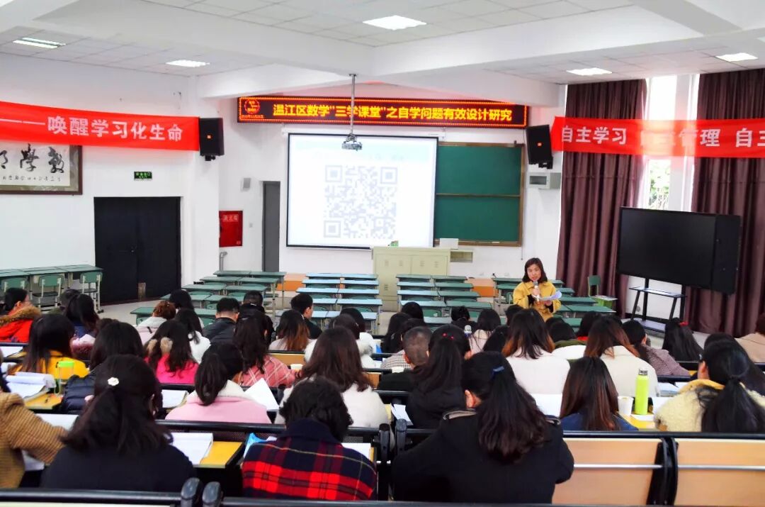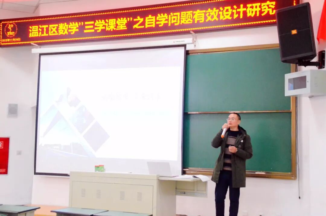 倾心指引,共话教学,区数学中心组唐恬老师组织了交流环节,老师们围绕课堂中的问题设计进行了深入探讨,一是如何基于学科本质,设计真实的并体现学科核心素养的问题;二是如何完整地设计问题串,进行驱动的学习过程。中心组蒋波老师做了《拓展源头,引来活水——“三学课堂”之“自学环节问题设计研究”》的专题讲座,蒋老师通过真实鲜活的案例对本次活动主题进行了深入解读,老师们在聆听中思考,在思考中提升。