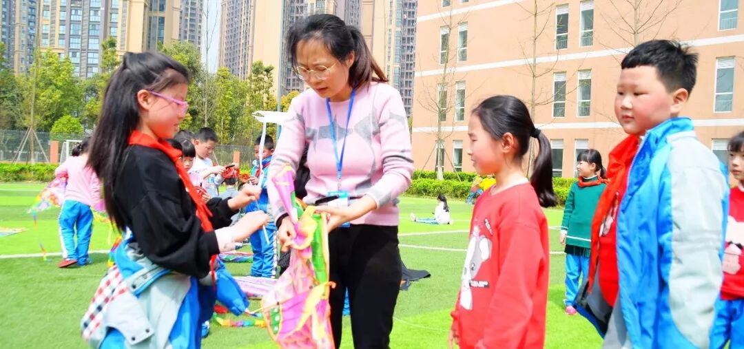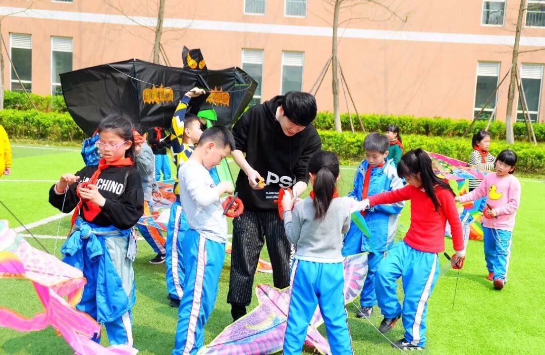 老师们也兴致勃勃地参与其中,有孩子跑来跟前:“老师,可以帮我系一下风筝线吗?”“好的,你看,这样系,我教你。”