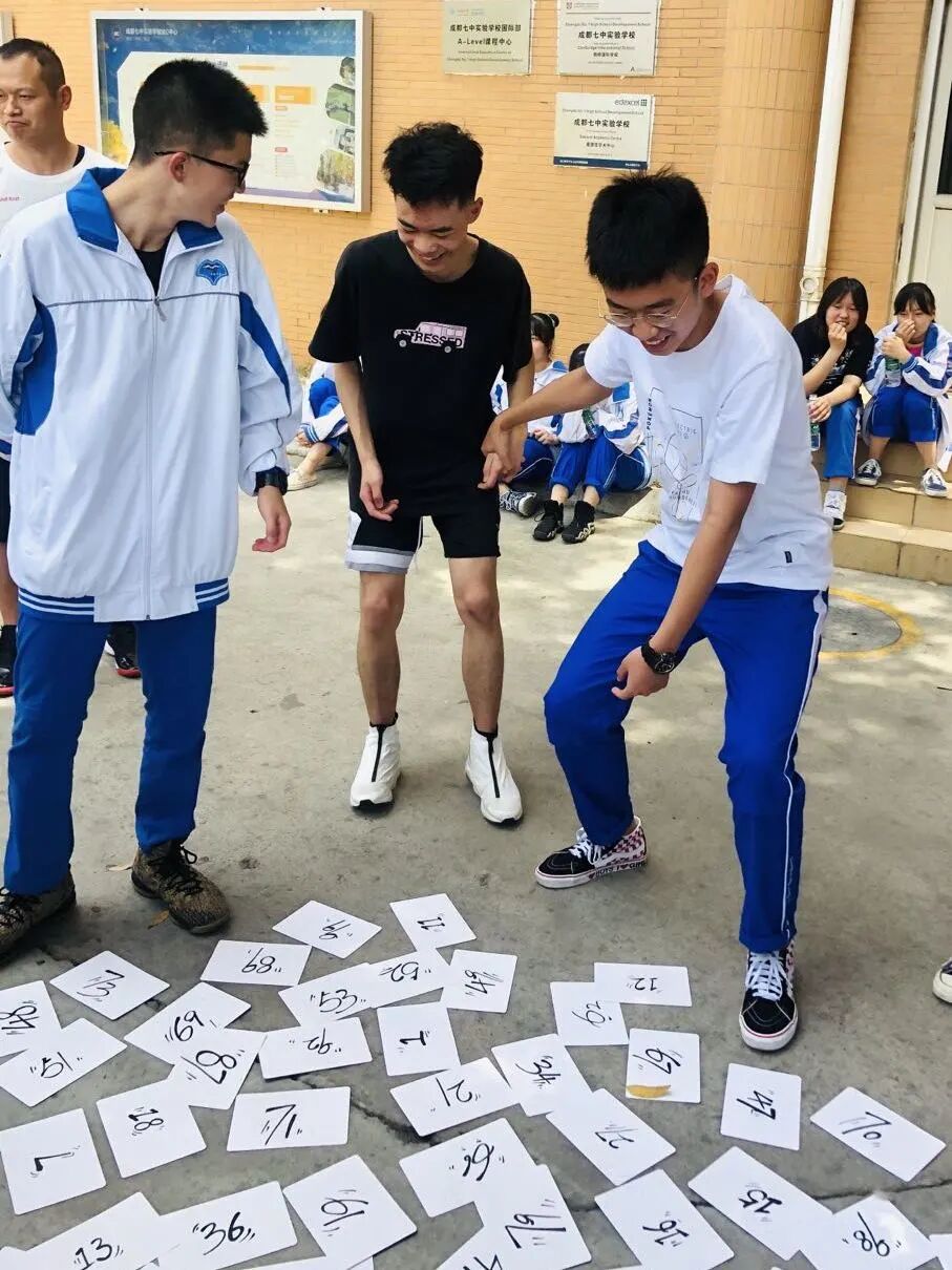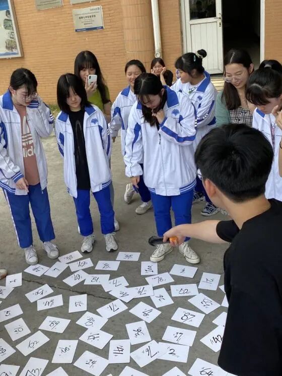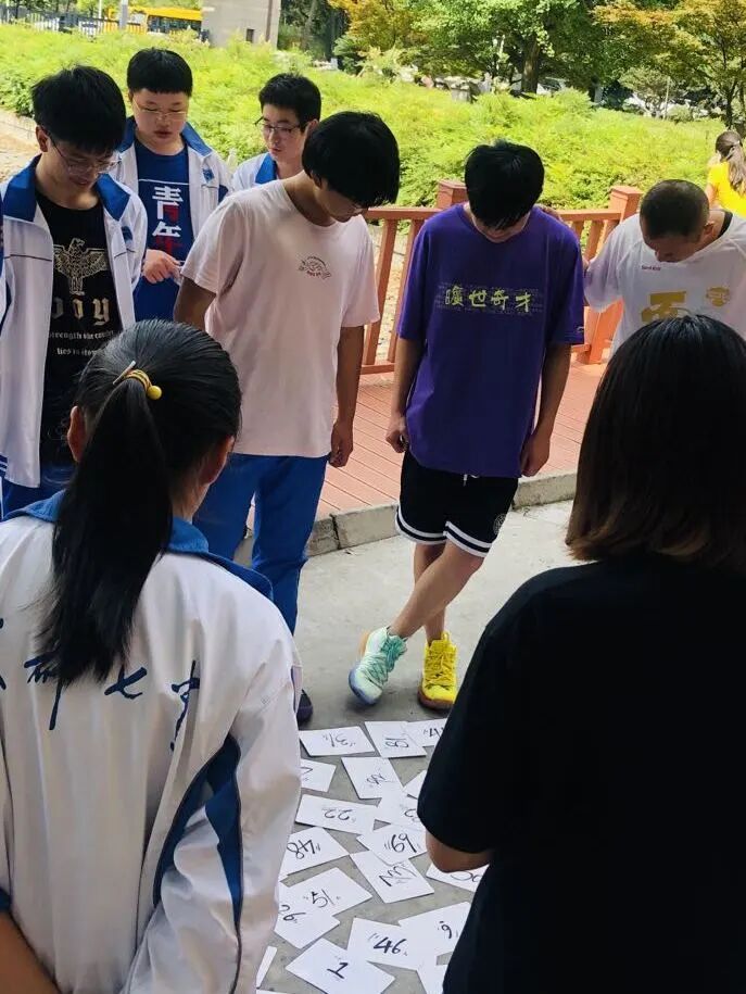 经历了踩气球这样的体力游戏,同学们分组完成猜数字游戏。数字1-100被打乱摆放在地上,每一组10名同学按照1到100的顺序依次找出每个数字。考验同学们的观察力和团队协作能力。